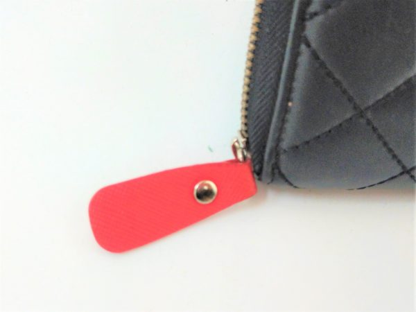 シャネルのコインケースや財布には、金具もしくは本体と同じカラーのレザーのファスナープルが使用されます。 こちらの基準外品(偽物,コピー品)は本体と異なるカラーのファスナープルが使用されてるので、ココでも基準外品(偽物,コピー品)を疑うことができます。